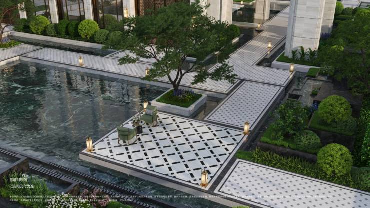 提取欧洲贵族的宫廷卷草纹,以全石材拼花铺装园林,精筑成都首例宫廷庄园式私家园囿;