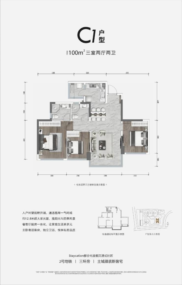 梯户比:2T3户、2T4户,面积:100㎡套三-123㎡套四