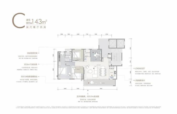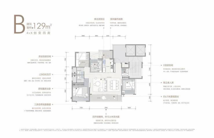 【LDKB社交厅】约6.9米大面宽客餐厅与厨房、阳台无界连通