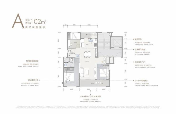 作为入门级产品,102平户型有几个优点,一是1梯2户公摊小,二是南北通透三面采光效果好,三是三开间朝南,面宽9.9米;四是功能完善尺度合理,甚至还有单独的生活阳台