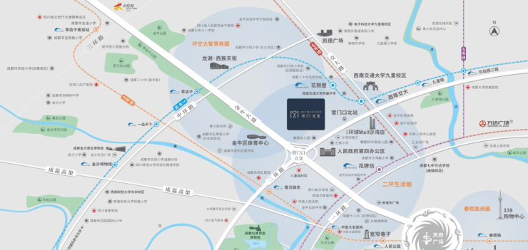 首开·龙湖成都西宸天街:体量约15万平方米的全业态商业体,满足日常生活所需;凯德广场·金牛店:面向家庭消费群体,是周边的社交中心;沙湾印象汇:集精品、时尚品等为一体的永辉精品超市。金牛大悦城(在建中):约10万平方米,引进“年轻力生活”品牌,塑造具有前沿消费风向的年轻生活新核;环球Mall沙湾店(在建中):总投资约60亿元,打造情景体验式商业空间、时尚创意空间等业态为一体的TOD文旅综合体。