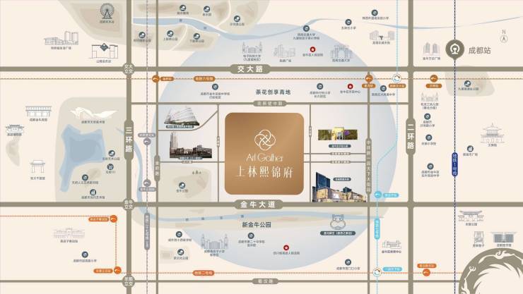 ��公园(天府艺术公园、新金牛公园、丝路云锦、茶文化公园、金牛公园,其中新金牛公园距离本案仅一街之隔。全国最长街心公园,占地面积257亩,长1.84公里,属于成都市首个 TOD 公园商圈,通过城市慢行系统将绿道与城市各大公共空间板块相连,系统集成生态公园、轨道站点、地下泊车等六大功能公园内以熊猫金丝猴双宝、三星堆、川酒、川茶、蜀绣、竹艺六大成都平原极其代表性的文化符号为主题,形成了 “一馆一主题、一馆一特色” 的六大天府文化胶囊博物馆)。